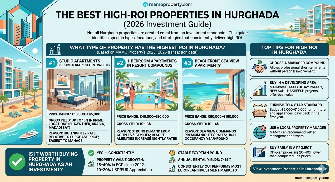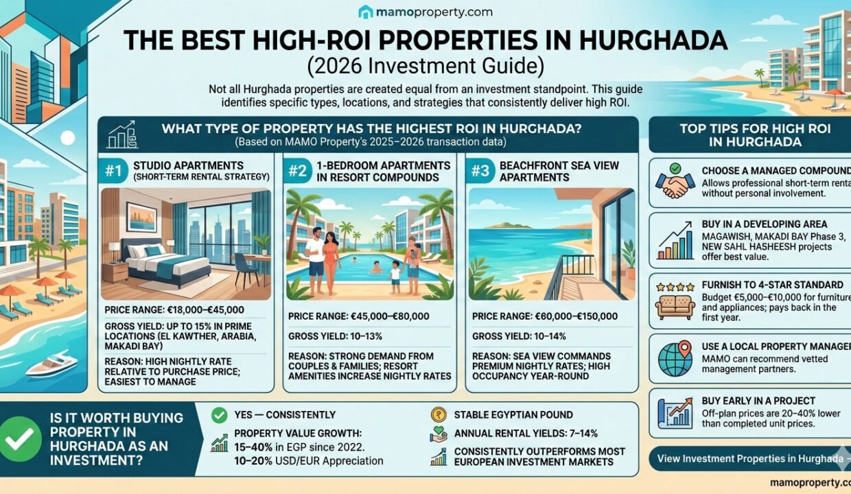 Not all Hurghada properties are created equal from an investment standpoint. This guide identifies the specific property types, locations, and strategies that consistently deliver high ROI in the Hurghada real estate market.