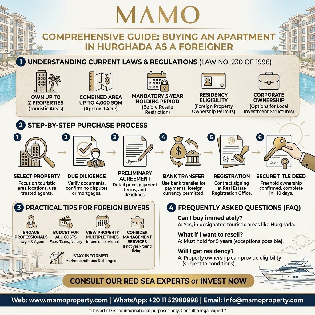 Foreigners can purchase apartments in Hurghada under **Law No. 230 of 1996**, which outlines the rights and restrictions associated with foreign property ownership in Egypt. Here are some key points to consider: