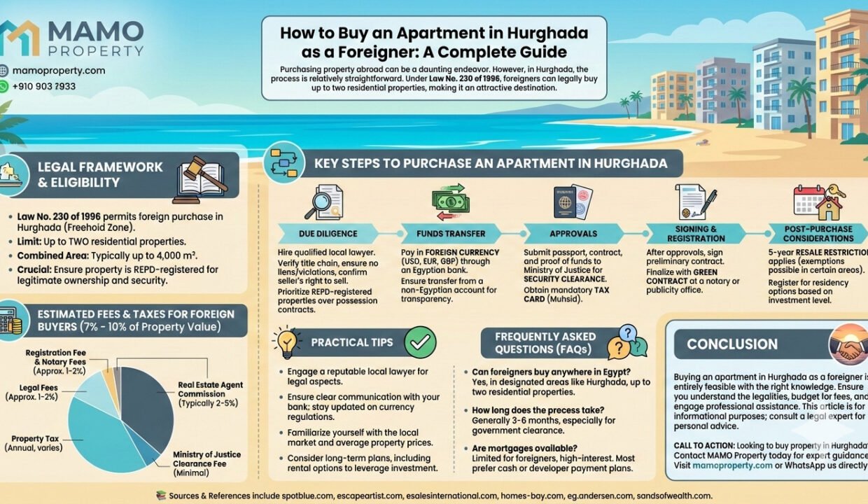 Buying an apartment in Hurghada as a foreigner is entirely feasible with the right knowledge and preparation. Ensure you understand the legalities, budget for fees, and engage professional assistance to make the process smoother. For personalized guidance and support throughout your property purchase journey, contact MAMO Property today.