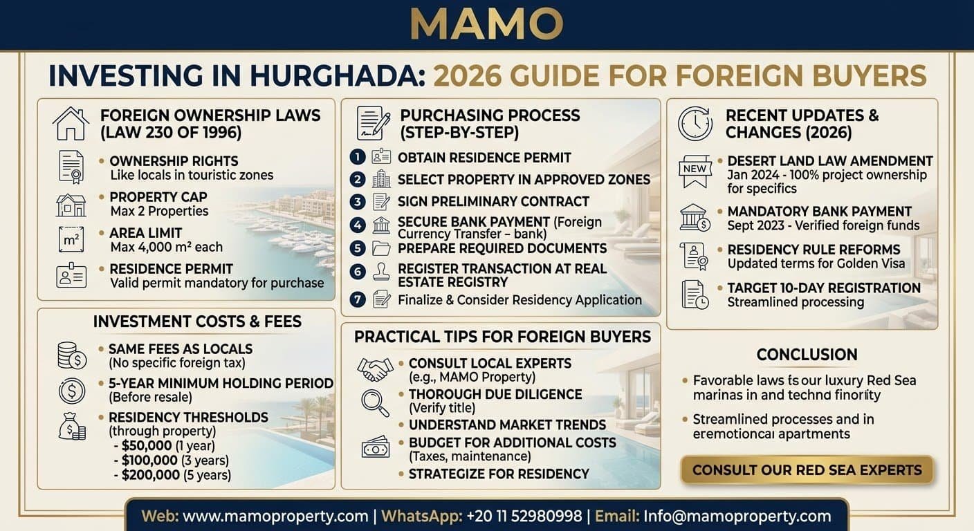 Investing in Hurghada’s real estate market offers a promising opportunity for foreign buyers in 2026. With favorable laws, a growing tourist sector, and a streamlined purchasing process, your investment can thrive in this beautiful coastal city. For expert guidance in navigating the Hurghada real estate landscape, don’t hesitate to contact MAMO Property.