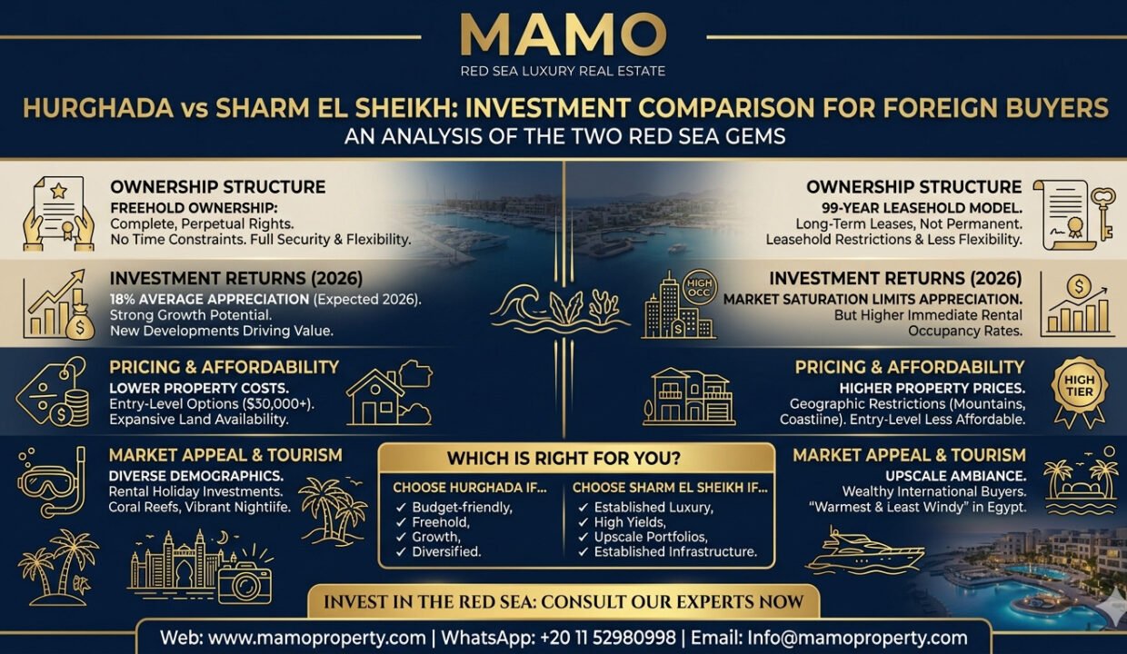 Hurghada allows freehold ownership for foreign buyers, offering complete ownership rights, while Sharm El Sheikh operates on a 99-year leasehold model.
